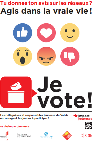 Le projet « Impact Jeunesse », une collaboration établie entre le délégué cantonal à la jeunesse et les délégué.e.s et responsables des Villes de Monthey, Martigny, Sion et Sierre se matérialise en vue des élections communales. Les visuels présents dans l’espace public et les réseaux sociaux visent à encourager les jeunes à donner leur voix lors de la prochaine échéance électorale. Le mot d’ordre : « Je vote ».