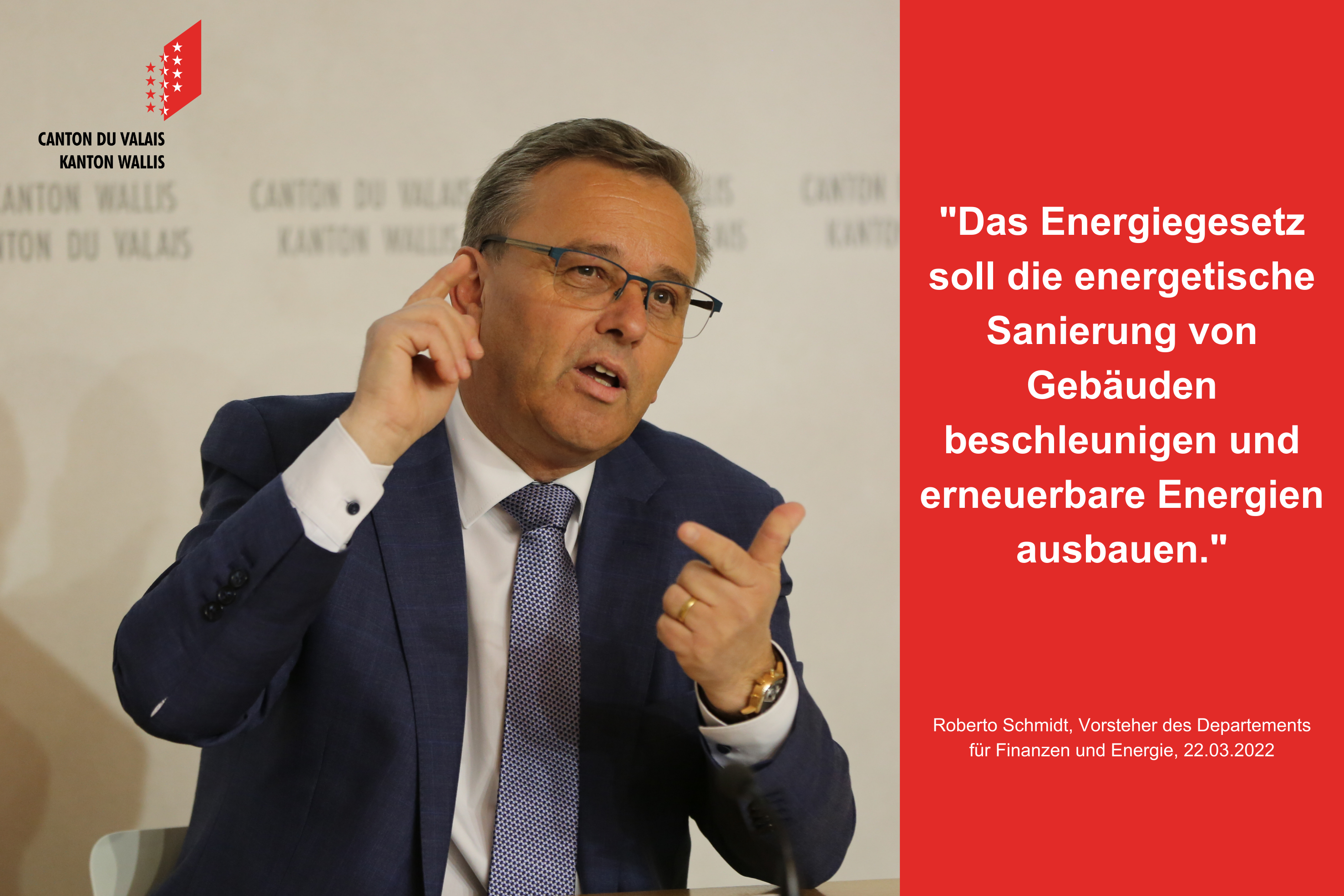 Der Staatsrat hat dem Grossen Rat die Botschaft und den Entwurf zum neuen kantonalen Energiegesetz übermittelt. Der Gesetzesentwurf beruht auf den klima- und energiepolitischen Zielen des Bundes und des Kantons. Er soll mit der Umsetzung der Mustervorschriften der Kantone im Energiebereich (MuKEn 2014) insbesondere die energetische Sanierung der Gebäude sowie den Ersatz der fossilen Energien durch erneuerbare Energien und durch die Nutzung von Abwärme beschleunigen. Der Staatsrat setzt dabei vor allem auf finanzielle Anreize und Beratungen und verzichtet weitgehend auf zwingende Massnahmen. Die energetische Sanierung der Wohngebäude wird sich längerfristig positiv auf die Luftqualität und damit auf die Gesundheit der Bevölkerung auswirken. Zudem kann das Wallis von der Elektrifizierung der Energieversorgung auch wirtschaftlich profitieren und seine Abhängigkeit von den fossilen Energien und damit vom Ausland reduzieren. Der Entwurf des neuen Energiegesetzes sollte im Herbst 2022 vom Parlament beraten werden.