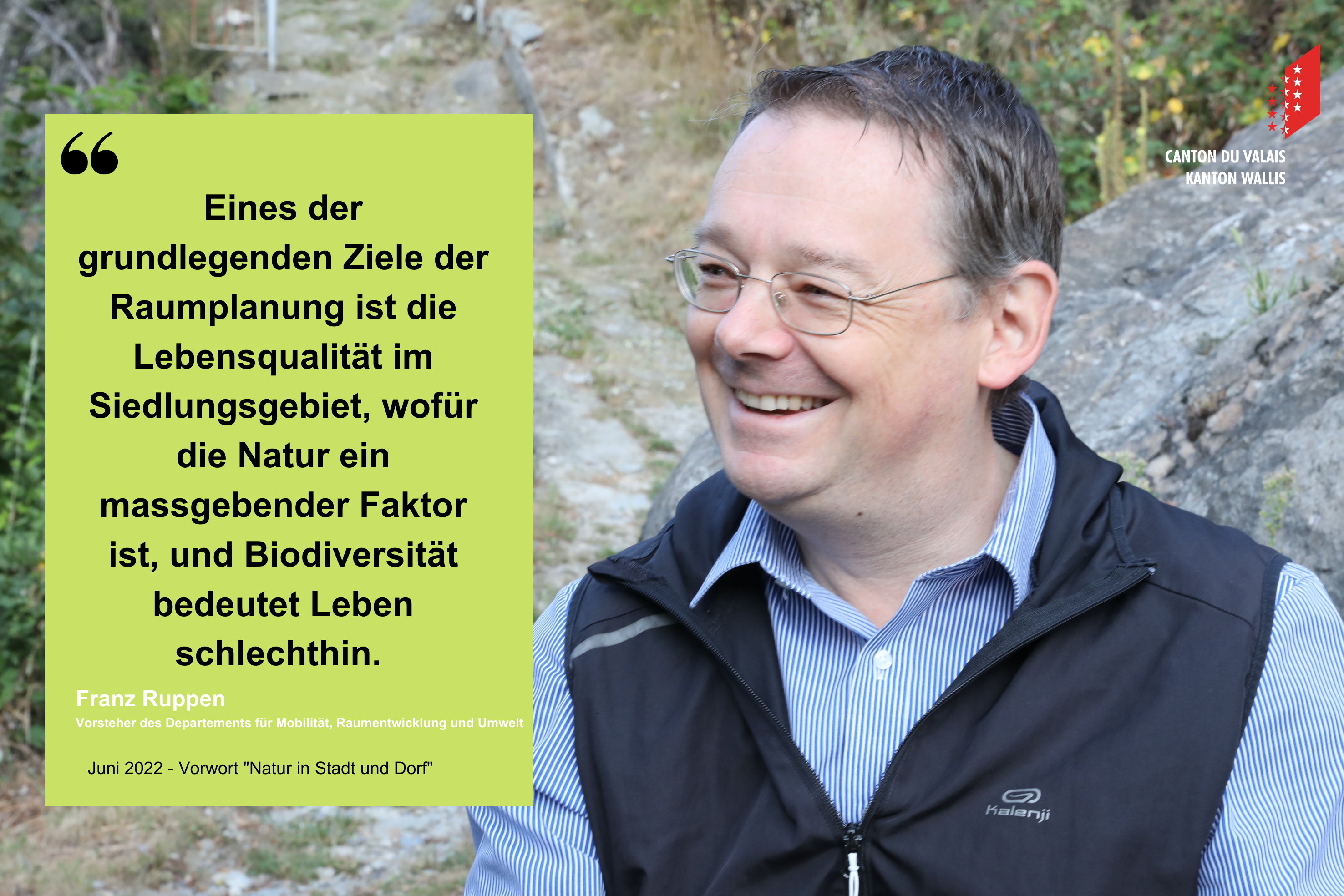 Um die Biodiversität und die Lebensqualität in Siedlungsgebieten zu fördern, geben die Dienststelle für Raumentwicklung (DRE) und die Dienststelle für Wald, Natur und Landschaft (DWNL) einen Leitfaden mit dem Namen «Natur in Stadt und Dorf» heraus. Das Werk richtet sich an die Walliser Gemeinden und vermittelt konkrete Handlungsansätze. Das Dokument erscheint zu einem günstigen Zeitpunkt, da die Gemeinden derzeit ihre Zonennutzungspläne (ZNP) und ihr kommunales Bau- und Zonenreglement (RCCZ) überarbeiten.
