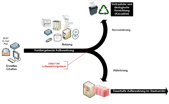 Eine geordnete Verwaltung der Dokumente und Archive setzt voraus, dass der gesamte Lebenszyklus der Dokumente – von ihrer Erstellung oder ihrem Empfang durch die Verwaltung bis zu ihrer kontrollierten Vernichtung oder Archivierung (Ablieferung oder Hinterlegung im Staatsarchiv) – berücksichtigt wird.