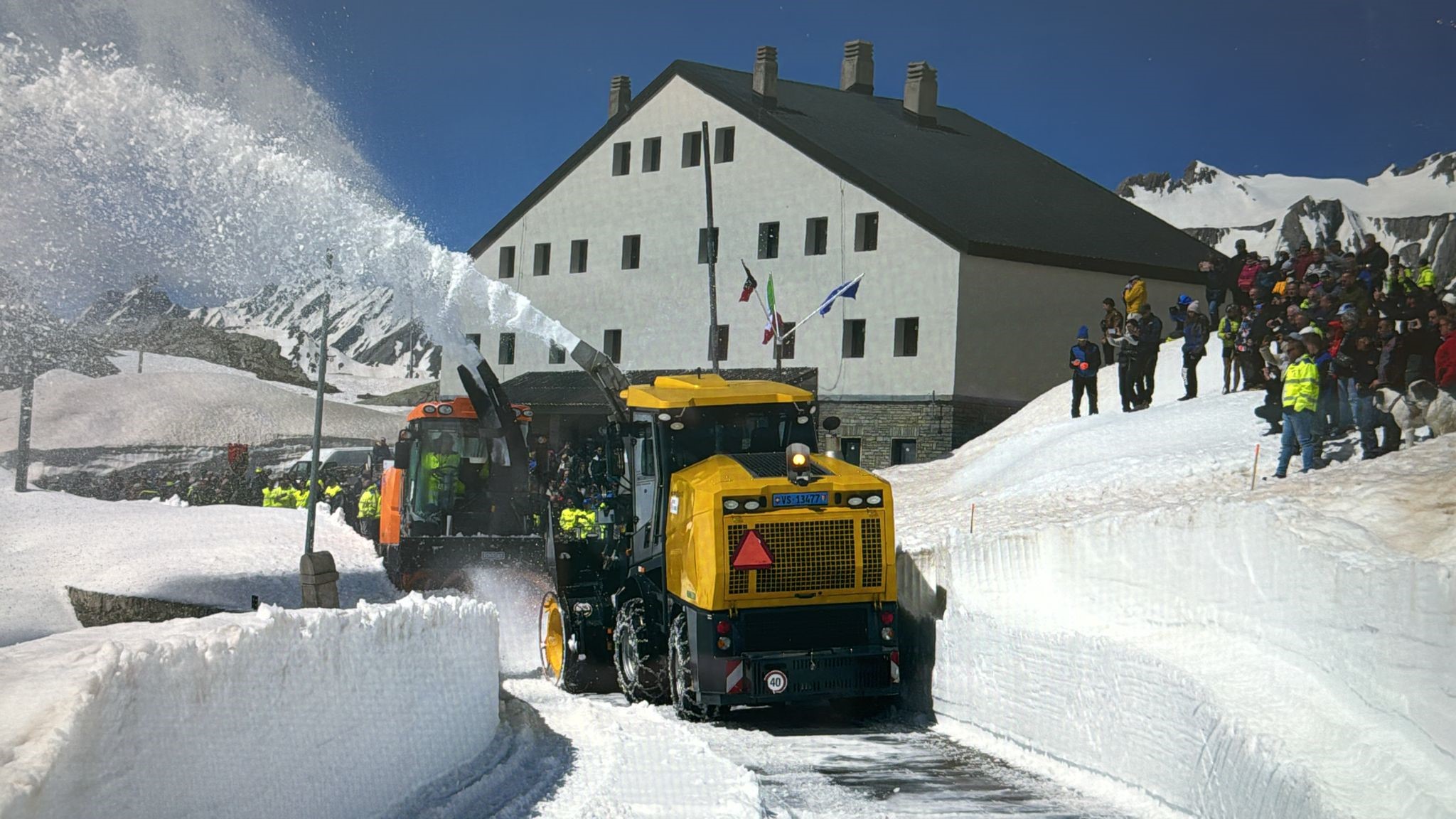 In diesem Jahr konnte die traditionelle Eröffnung des Passes am 1. Juni ausnahmsweise nicht stattfinden. Späte Schneefälle gepaart mit einer hohen Schneedecke erforderten zusätzliche Schneeräumungsarbeiten, sowohl auf der schweizerischen als auch auf der italienischen Seite. Erleichtert wird die Schneeräumung durch das eingerichtete geometrische Ortungssystem, das die Fräsmaschinen präzise auf dem Strassenverlauf hält. Begonnen wurde mit der Räumung der Passstrasse über den Gr. St. Bernhard, auf einer Strecke von 6 Kilometern ab der Galerie-Ausfahrt, am 2. Mai 2024.
