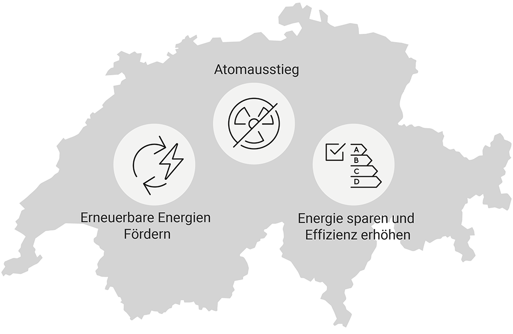 2011 beschloss der Bundesrat in seiner Energiestrategie 2050 den schrittweisen Ausstieg aus der Atomenergie. Die Energiestrategie beruht auf den folgenden 3 Säulen: