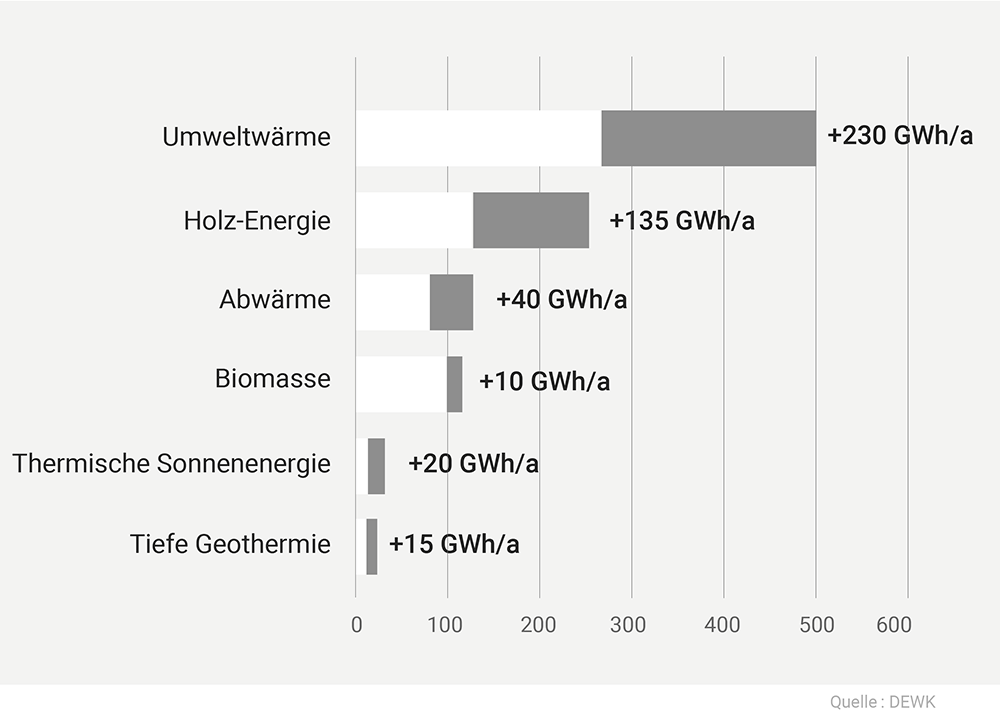 Für die einheimische Produktion von Wärme und Treibstoffen sowie die Verwertung der Abwärme gelten zwischen 2019 und 2035 die folgenden zusätzlichen Produktionsziele: