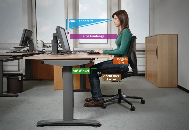 Die falsche Körperhaltung, oftmals resultierend aus einem falsch eingestellten persönlichen Arbeitsplatz, belastet Rücken und Schultern. Dabei bedarf es nur in den seltensten Fällen zusätzliche Arbeitsmittel, um diese Probleme zu lösen. Mit den folgenden praktischen Tipps lassen sich Symptome wie Nacken-, Schulter- und Rückenschmerzen oder müde Augen weitgehend vermeiden.