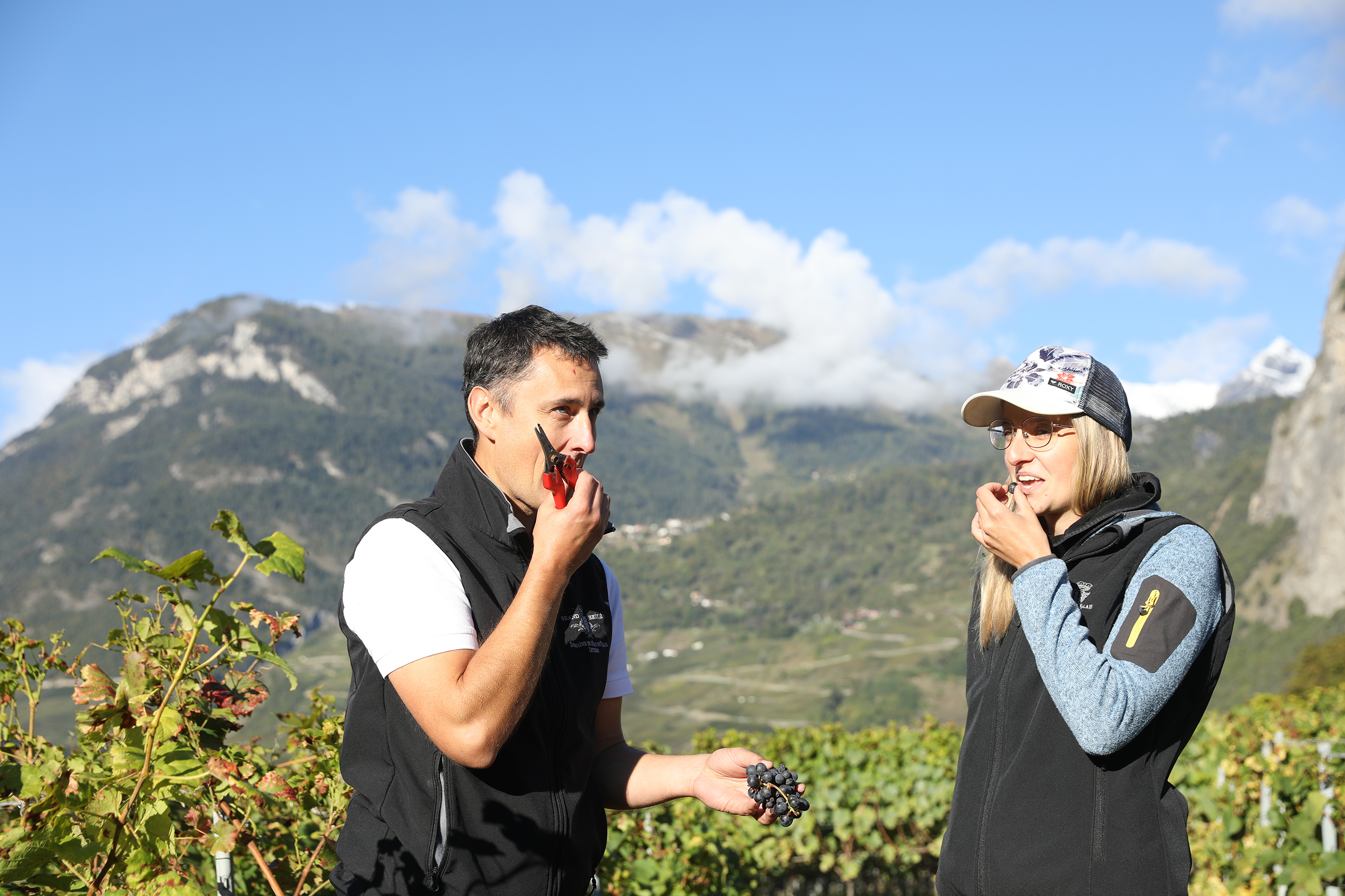 Was gestern das einzig Wahre war, ist es heute nicht mehr unbedingt. Dies gilt auch für die Produktionsverfahren. Im Domaine Grand Brûlé hat man sich bewusst für den biologischen Anbau entschieden. Dieser neue Ansatz wurde bereits auf mehr als der Hälfte des Weinguts umgesetzt. «Die Herausforderung besteht darin, die Qualität aufrechtzuerhalten und gleichzeitig die Anzahl der Produkte zu reduzieren. Die Branche wird immer umweltbewusster. Viele Winzer verfolgen diesen Weg. Unsere Aufgabe ist es, sie dabei zu unterstützen», betont Angélique Délèze. Die Kulturchefin und der Kellermeister teilen diese Anschauung: «Es ist gut, sich neu erfinden zu müssen, ich liebe Herausforderungen», erklärt Eddy Dorsaz begeistert. «Ich weiss nicht, ob die Arbeit dadurch komplexer wird, aber auf jeden Fall werden wir aufmerksamer sein müssen.»