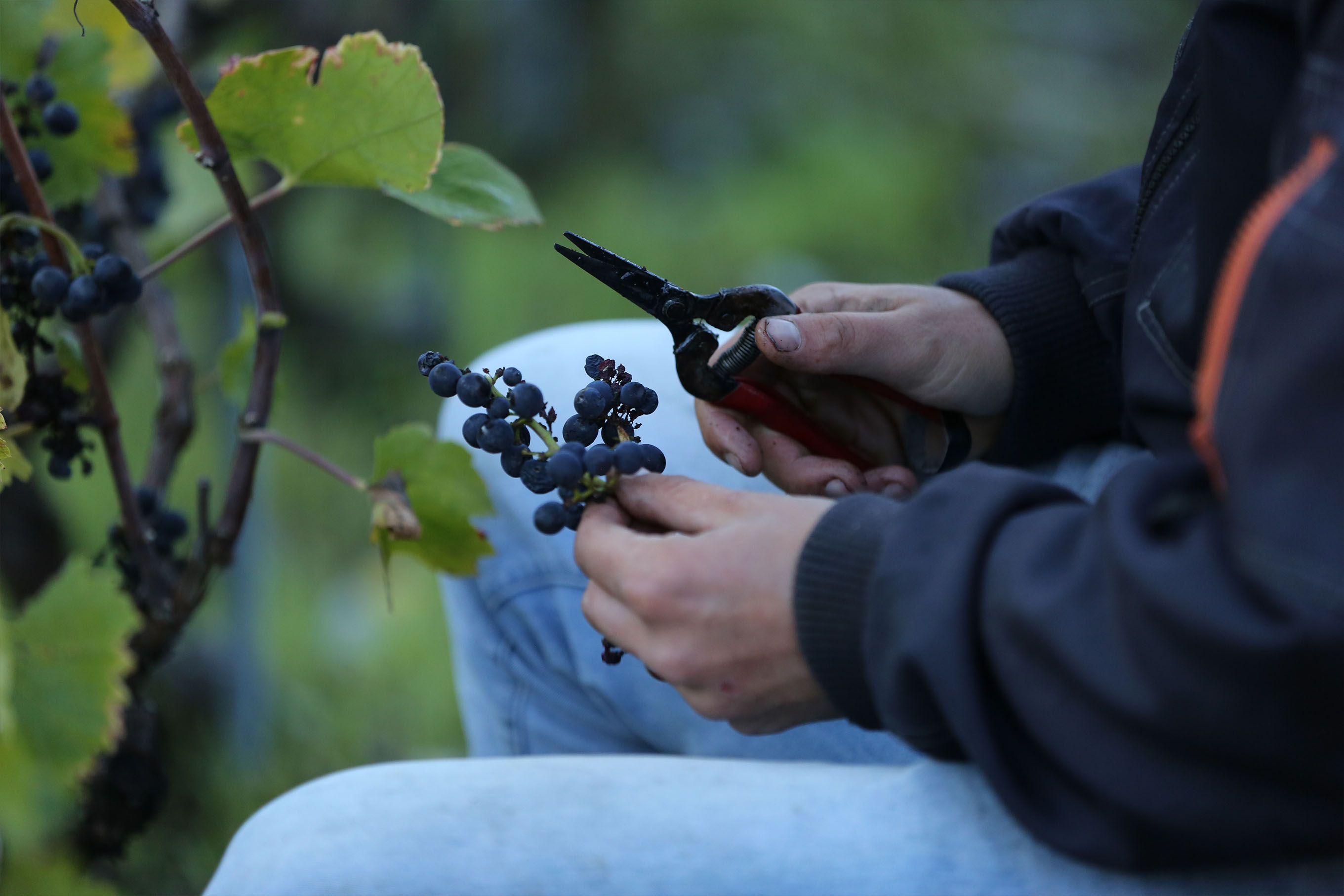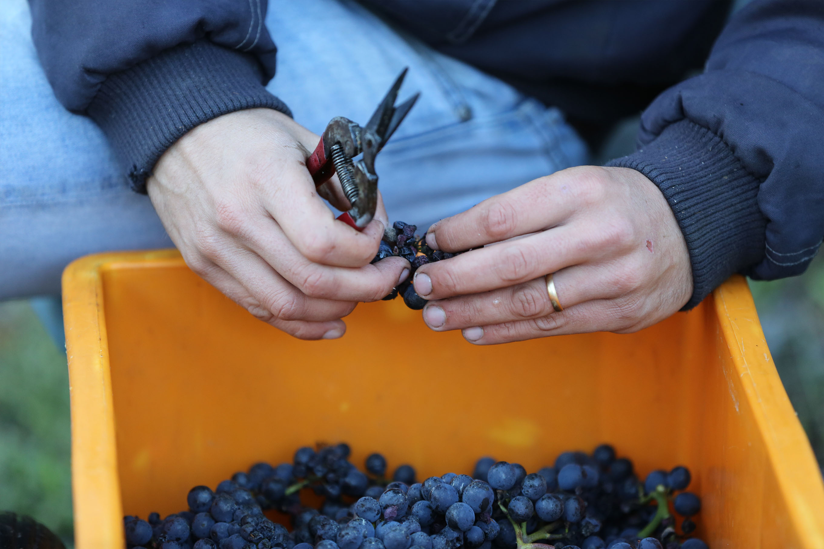 Sortieren, Beere für Beere. Im Rebberg geht die Pinot-Noir-Lese weiter. Für Angélique ist das sehr zeitaufwändig: «Für eine Rebzeile von 100 Metern benötigt eine Person normalerweise eine Stunde. So hingegen, wenn wir richtig sortieren wollen, dauert es dreimal so lange.»