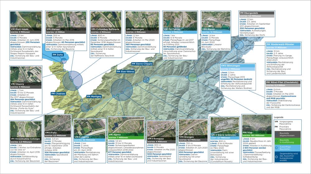 Die dritte Säule der Hochwasserschutzstrategie ist der Bau der 3. Rhonekorrektion und liegt im Zuständigkeitsbereich des kantonalen Amtes Rhonewasserbau (KAR3). Seit der Überschwemmung vom Oktober 2000 konnten durch die bis heute realisierten Arbeiten die Sektoren gesichert werden, die für die Bevölkerung die grösste Gefahr darstellen. Dank der Dammverstärkungen in zwölf Sektoren von Port-Valais bis Obergesteln (Goms) sind heute etwa 3’500 Menschen, die in unmittelbarer Nähe des Flusses leben, geschützt. Durch die Prioritäre Maßnahme Visp ist nun linksufrig die gesamte Industrie- und Bauzone von Visp mit einem Schadenspotential von 3 Milliarden Franken und etwa 14'000 Personen geschützt. Dieser Schutz wird jedoch erst dann dauerhaft wirksam sein, wenn die Arbeiten zur Sicherung des Sektors Brigerbad abgeschlossen sind. Gleichzeitig arbeitet das KAR3 an der Erstellung der Projektdossiers zur öffentlichen Auflage für die Prioritären Massnahmen von Chablais, Martigny, Sion und Sierre-Chippis.