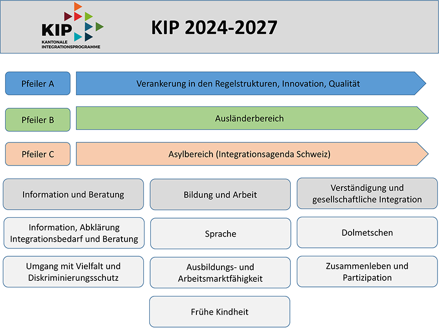 Die in der KIP verankerten Förderbereiche beziehen sich auf Information und Beratung, Bildung und Arbeit sowie Verständigung und gesellschaftliche Integration. Jeder Kanton legt in seinem KIP fest, wie er seine Ziele erreichen will.