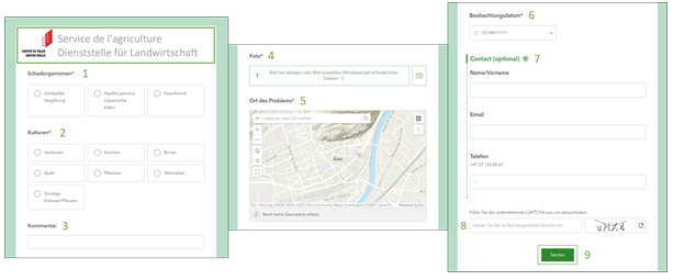 Wenn Sie sich für die Version über Ihren Internetbrowser entscheiden, gelangen Sie direkt zum Formular. Wählen Sie einen der verfügbaren Schadorganismen (1) und die Kultur aus, an der Sie den Organismus beobachtet haben (2) (Abb. 4). Fügen Sie einen Kommentar hinzu, wenn Sie weitere Angaben machen möchten (3). Bevor Sie das Formular ausfüllen, machen Sie ein Foto des Schadorganismus und fügen das Foto im Formular ein (4). Fügen Sie den Ort hinzu, an dem Sie den Schädling beobachtet haben, indem Sie den Ort manuell auf der Karte auswählen (5) und ergänzen Sie das Datum der Beobachtung (6). Wenn Sie möchten, können Sie Ihre persönlichen Kontaktdaten hinterlassen (7). Dies ermöglicht uns, Sie zu kontaktieren, falls es Probleme mit dem Zugang gibt. Um das Formular abzuschliessen, füllen Sie das Captcha aus (8) und klicken Sie dann auf "Senden" (9).