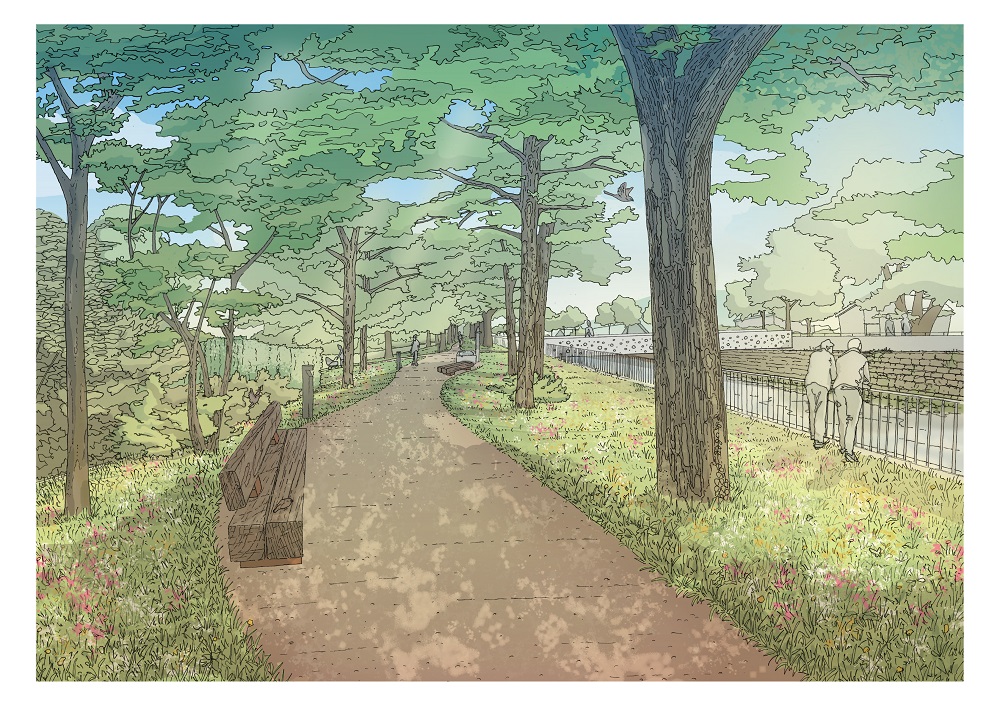 An dieser Stelle wird das Flussbett eine natürlichere Form annehmen, die der Biodiversität und sozialen Aktivitäten in direktem Zusammenhang mit dem Gewässer zugutekommen soll. Der stark bebaute Teil flussaufwärts wird neue Infrastrukturen (Bänke, Leuchten, Brunnen) sowie neue Anpflanzungen aufweisen. Die gesamte Einrichtung wird die Fauna und Flora in den Vordergrund stellen und soll zu einem bevorzugten Ort der Erholung in Monthey werden.