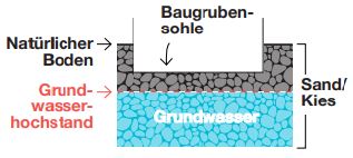 Der Abstand zwischen der Baugrubensohle und dem Grundwasserhochstand beträgt 0.3 bis 2 m.