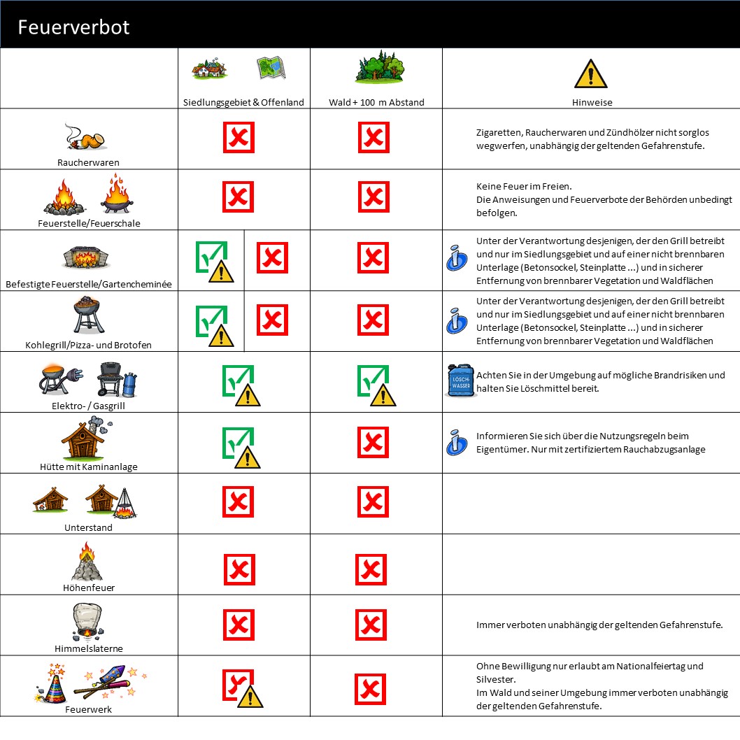 Alle Feuer mit offener Flamme oder jede Aktivität, die einen Brandausbruch verursachen kann, sind unabhängig von Ort und Anlass (Grillieren, 1.-August-Feuer etc.) absolut verboten.
