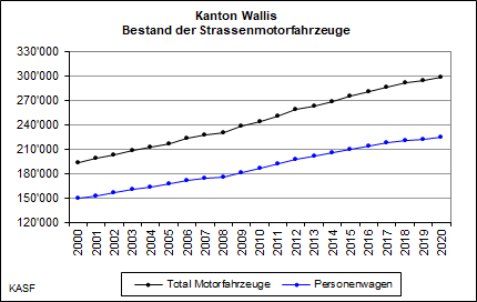 Zwischen 2000 und 2020 stieg der Bestand der Strassenmotorfahrzeuge auf schweizerischer Ebene um 36% an und im Kanton Wallis um 55%. Im Jahre 2020 betrug die Anzahl der Strassenmotorfahrzeuge 298 Tausend für das Wallis, was 26% des Strassenmotorfahrzeugebestands der Genferseeregion (VS, VD, GE) entspricht und 4,8% der Strassenmotorfahrzeuge der Schweiz.