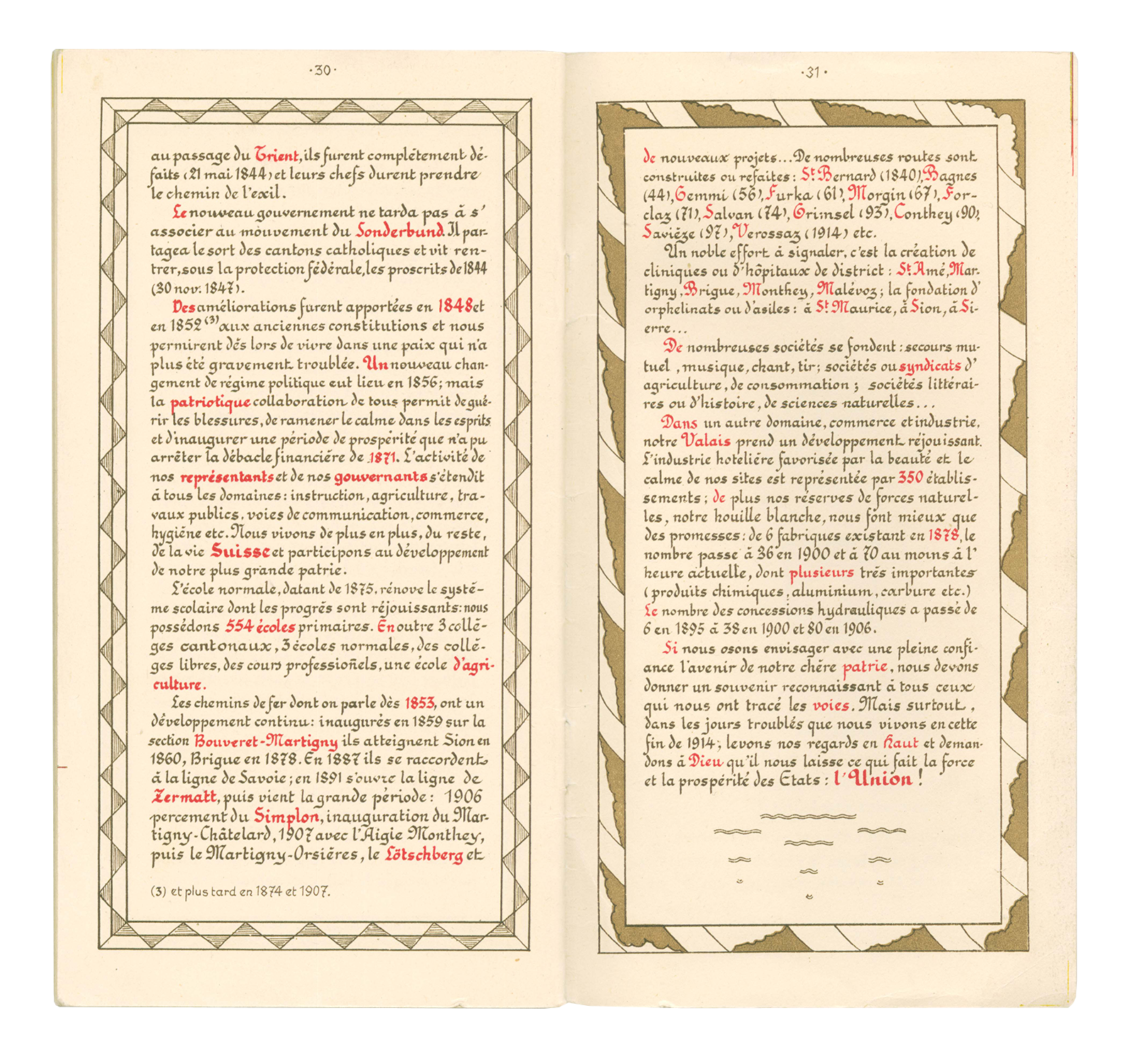 Ainsi, en 1915, on soulignait l’importance de rester unis face au danger que représentait une guerre mondiale, reléguant l’événement à l’arrière-plan ; en 1965/1966 – la catastrophe de Mattmark ayant décalé une partie des manifestations –, on mettait en parallèle le Valais d’autrefois avec la Suisse de l’époque, confrontée au même questionnement face à la nouvelle Europe qui se dessinait ; en 1990, on manifestait le désir de montrer que le Valais n’était pas uniquement le Vieux-Pays des clichés, mais qu’il était ouvert sur l’extérieur et possédait les moyens techniques et intellectuels pour aborder les défis de l’avenir.