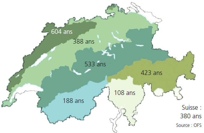 Figure 1 Réserves de surfaces agricoles utiles si la perte de terres agricoles se poursuit au rythme actuel (Protection des terres agricoles – Bilans et défis, OFAG, Berne 2012)