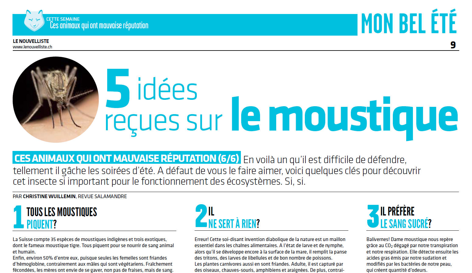 5 idées reçues sur le moustique. Salamandre paru dans le Nouvelliste, le 17 juillet 2022.