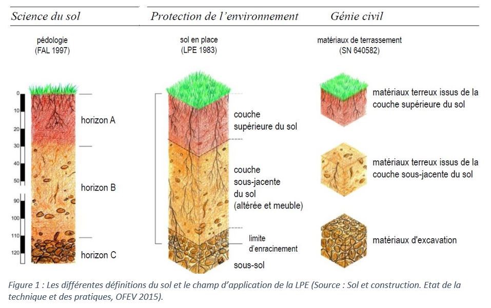 La Loi fédérale sur la Protection de l’environnement (LPE) définit le sol comme « la couche de terre meuble de l’écorce terrestre où peuvent pousser les plantes » (art. 7, al 4bis). Cette « couche de terre » peut varier en épaisseur, texture, structure, couleur, etc. et comprend généralement plusieurs strates, appelée « horizons » (figure 1). Lors de travaux impliquant des décapages, stockages et remises en état de sols, ces horizons pédologiques ont été regroupés en 2 couches :