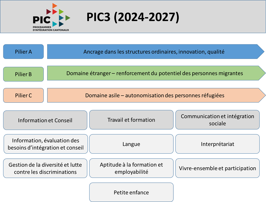 Les PIC établissent des objectifs et mesures visant à faciliter l'intégration des personnes migrantes en Suisse ; ils existent depuis 2014 et sont redéfinis chaque 4 ans. Leur financement repose sur des contributions de la Confédération, des cantons et des communes.