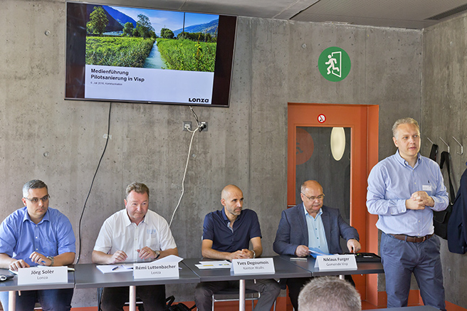 In Visp konnte die erste Sanierungsmassnahme in Angriff genommen werden. Dabei wurde die oberste Bodenschicht eines mit Quecksilber verschmutzten Grundstücks beim Sportplatz Visp entfernt. In Anwendung der Altlastenverordnung hatte die Dienststelle für Umweltschutz (DUS) Sanierungsziele und Sanierungsmassnahmen festgelegt. Eine von der DUS ausgearbeitete Vereinbarung, welche von Lonza und der Gemeinde Visp unterzeichnet wurde, regelt die Modalitäten dieser Sanierung. Die Kosten werden von Lonza ohne Präjudiz vorfinanziert. Die Erfahrungen aus der Pilotsanierung sollen die Grundlage für die Erstellung eines übergeordneten Sanierungskonzepts bilden.