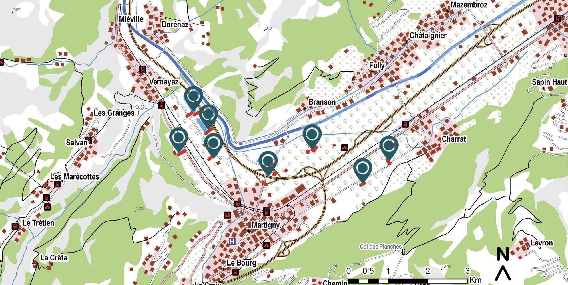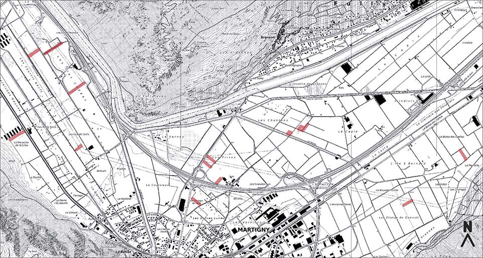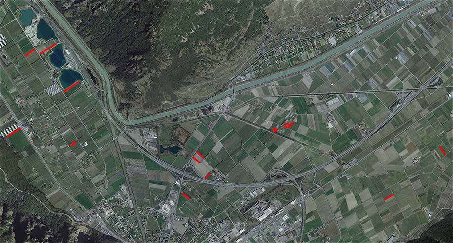 En étroite collaboration avec les exploitants agricoles, 13 sites ont été choisis pour implanter les haies. La localisation des mesures a été avant tout dictée par des impératifs pragmatiques (souci de compatibilité avec les impératifs de culture du sol, approche bottom-up). Ces réalisations sont complémentaires aux aménagements potentiels des futures digues de protection contre les crues du Rhône.