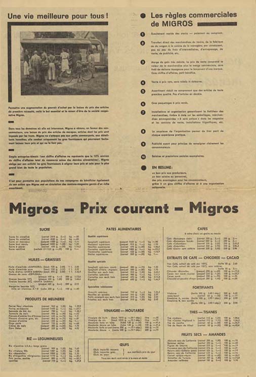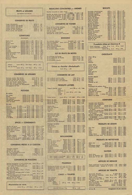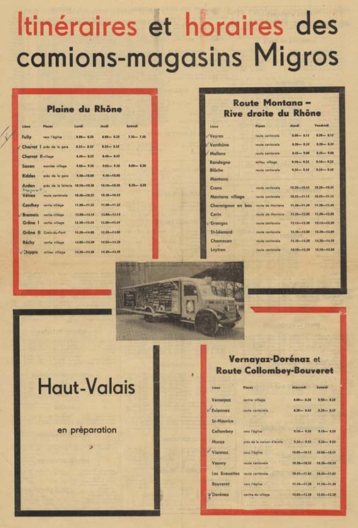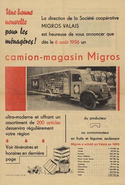 Die Verkaufswagen und insbesondere die Migros-Wagen haben viele Reaktionen hervorgerufen. Einige sahen darin das Ende der kleinen Dorfläden. Andere wiederum erkannten darin die Möglichkeit, endlich an Lebensmittel zu kommen, die bis dahin kaum erhältlich waren. Auf jeden Fall ist es immer interessant, einen Blick auf die Preise einiger Lebensmittel zu werfen, die natürlich im Verhältnis zu den damaligen Löhnen betrachtet werden müssen. So kosteten Spaghetti «supérieurs» 98 Rappen pro Kilo, der Preis für eine 290-Gramm-Packung Chicorée-Kaffee betrug 50 Rappen und eine Tafel Milchschokolade kostete 65 Rappen. En Güete!