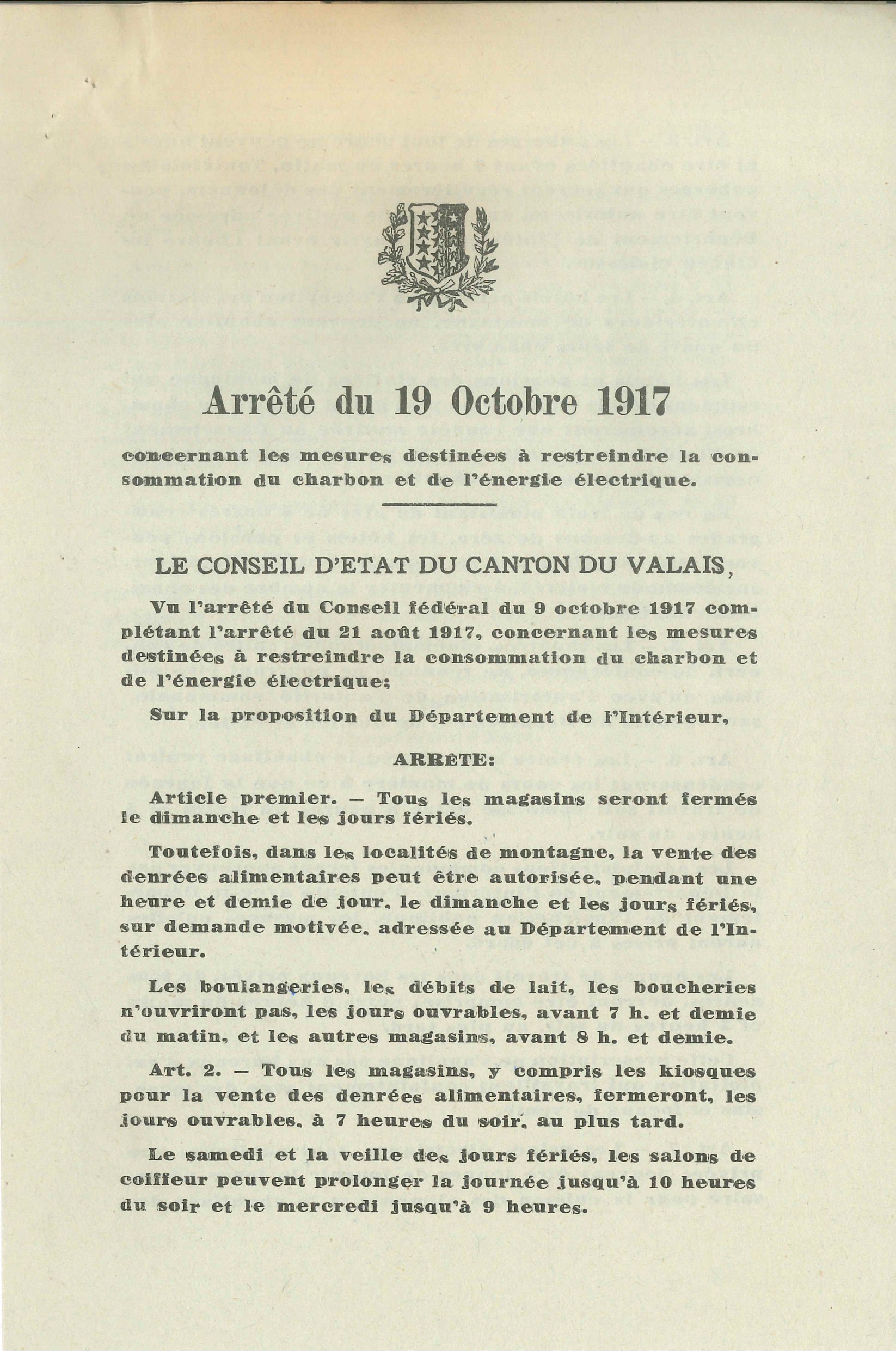 Le Conseil d’Etat du canton du Valais promulgue un arrêté le 19 octobre 1917 en ce sens où il est notamment prévu :