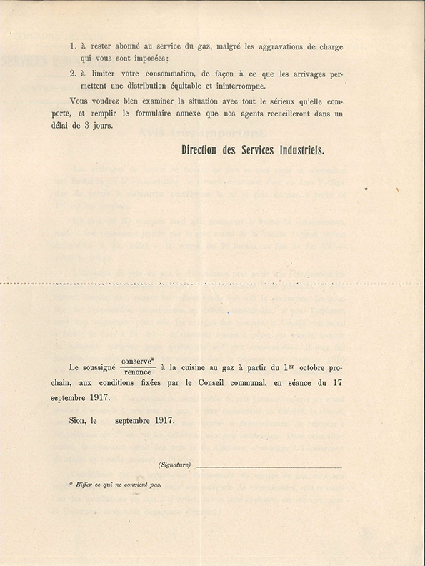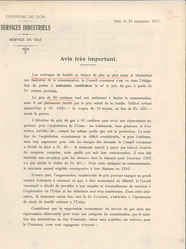 | Avis émis par le Service du gaz de la commune de Sion, 18 septembre 1917. CH AEV 3510-1, 2.6. | |