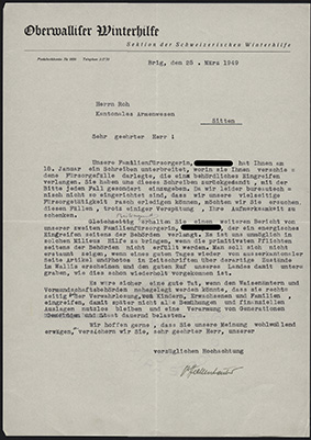 Pour cela, les collaborateurs des Archives de l'Etat du Valais ont exploré différents fonds, dont le fonds de l'actuel Service juridique de la sécurité et de la justice (SJSJ), qui contient des dossiers de mesures de coercition à des fins d'assistance et de placements extrafamiliaux (AEV, fonds 5060-4 et 5060-5), le fonds de l'actuel Service de l'action sociale (SAS), qui contient des dossiers de bénéficiaires de prestations sociales (AEV, 4620-5), et le fonds de l'actuel Office pour la protection de l'enfant (OPE), qui contient des dossiers de personnes prises en charge (AEV, 4640-1993/65). La recherche de dossiers est complétée par la recherche dans les archives communales de documents relatifs à l'office des orphelins et à l'assistance publique et, si nécessaire, étendue aux archives des autorités de protection de l'enfant et de l'adulte. Même si, dans de nombreux cas, de telles recherches de dossiers ne donnent qu'une image incomplète, elles permettent de retracer les biographies des personnes concernées et d’apporter des réponses à des questions existentielles.