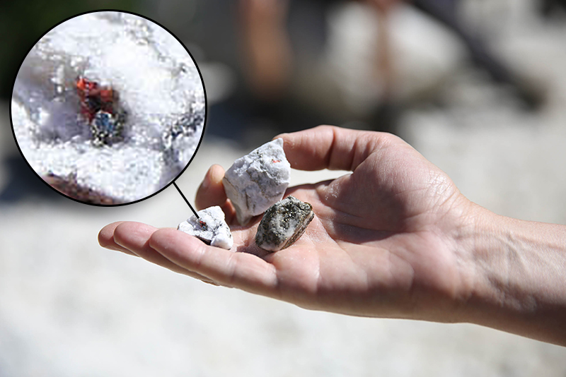 Auf kurze 1,25 Kilometer dieser Wanderwege begeben wir uns nun gemeinsam. Entlang des Gesteinslehrpfads laufen wir bis zur Mineraliengrube Lengenbach. Die etwa halbstündige Wanderung führt an elf Stationen vorbei, die spannende Einblicke in die ausserordentliche Gesteinsvielfalt des Binntals vermitteln. Unterwegs fallen Hubert Gorsatt so allerlei Kindheitserinnerungen ein. «Früher kamen wir oft zur Grube und haben ein unterhaltsames Schauspiel beobachtet. Es kamen Leute aus nah und fern, alle mit der Absicht, unter den riesigen, in der Grube abgebauten Steinbrocken, etwas Wertvolles zu finden.» Manche hätten sich das Gestein regelrecht gegenseitig aus den Händen gerissen. Schmunzelnd fügt er hinzu, dass er und seine Freunde damals Fundstücke aus der Grube – meistens von keinem besonderen Wert - an nichtsahnende Touristen verkauft hätten. Heute gibt es diese Strassenstände nicht mehr. Dafür begegnet man auf der Abraumhalde der Grube zahlreichen mit Hammer und Meissel bewaffneten Kindern. Sie suchen eifrig nach dem Mineral Pyrit, das im Volksmund auch als «Katzengold» bekannt ist. Es ist gelb und glänzt, ist aber trotzdem kein Gold und hat wohl schon so manchen Schürfer enttäuscht. Von einst etwa 150 Mineralarten, die in der Mineraliengrube Lengenbach gefunden wurden, sind das Katzengold und der knallrote Realgar, der auf dem weissen Dolomit farblich sofort heraussticht, heute die verbreitetsten Arten.