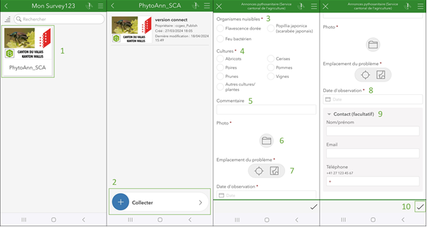 Sobald Sie die Anwendung heruntergeladen haben, ist das Formular immer verfügbar und muss nicht mehr heruntergeladen werden. Klicken Sie auf das Logo (1) in Ihrem Verzeichnis und dann auf "Sammeln" (2) (Abb. 3). Wählen Sie einen der verfügbaren Schadorganismen (3) und die Kultur aus, an der Sie den Organismus beobachtet haben (4). Fügen Sie einen Kommentar hinzu, wenn Sie weitere Angaben machen möchten (5). Bevor Sie das Formular ausfüllen, machen Sie ein Foto des Schadorganismus und fügen das Foto im Formular ein (4). Fügen Sie den Ort, an dem Sie den Schädling beobachtet haben, entweder durch manuelles Auswählen des Ortes auf der Karte oder durch Geolokalisierung (7), sowie das Datum der Beobachtung (8) hinzu. Wenn Sie möchten, können Sie Ihre persönlichen Daten hinterlassen (9). Dies ermöglicht es uns, Sie im Falle von Zugangsproblemen zu kontaktieren. Um das Formular abzuschliessen, klicken Sie unten rechts auf das markierte Symbol (10).