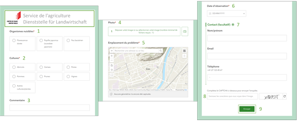Wenn Sie sich für die Version über Ihren Internetbrowser entscheiden, gelangen Sie direkt zum Formular. Wählen Sie einen der verfügbaren Schadorganismen (1) und die Kultur aus, an der Sie den Organismus beobachtet haben (2) (Abb. 4). Fügen Sie einen Kommentar hinzu, wenn Sie weitere Angaben machen möchten (3). Bevor Sie das Formular ausfüllen, machen Sie ein Foto des Schadorganismus und fügen das Foto im Formular ein (4). Fügen Sie den Ort hinzu, an dem Sie den Schädling beobachtet haben, indem Sie den Ort manuell auf der Karte auswählen (5) und ergänzen Sie das Datum der Beobachtung (6). Wenn Sie möchten, können Sie Ihre persönlichen Kontaktdaten hinterlassen (7). Dies ermöglicht uns, Sie zu kontaktieren, falls es Probleme mit dem Zugang gibt. Um das Formular abzuschliessen, füllen Sie das Captcha aus (8) und klicken Sie dann auf "Senden" (9).