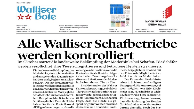 04.04.2024 | Walliser Bote | Moderhinke-Alle Walliser Schafbetriebe werden Kontrolliert