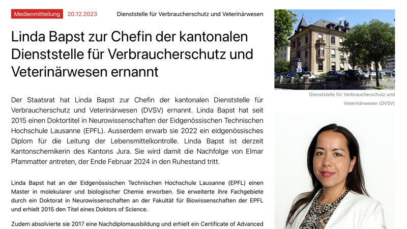 20.12.2023 | Kanton Wallis | Linda Bapst zur Chefin der kantonalen Dienststelle für Verbraucherschutz und Veterinärwesen ernannt