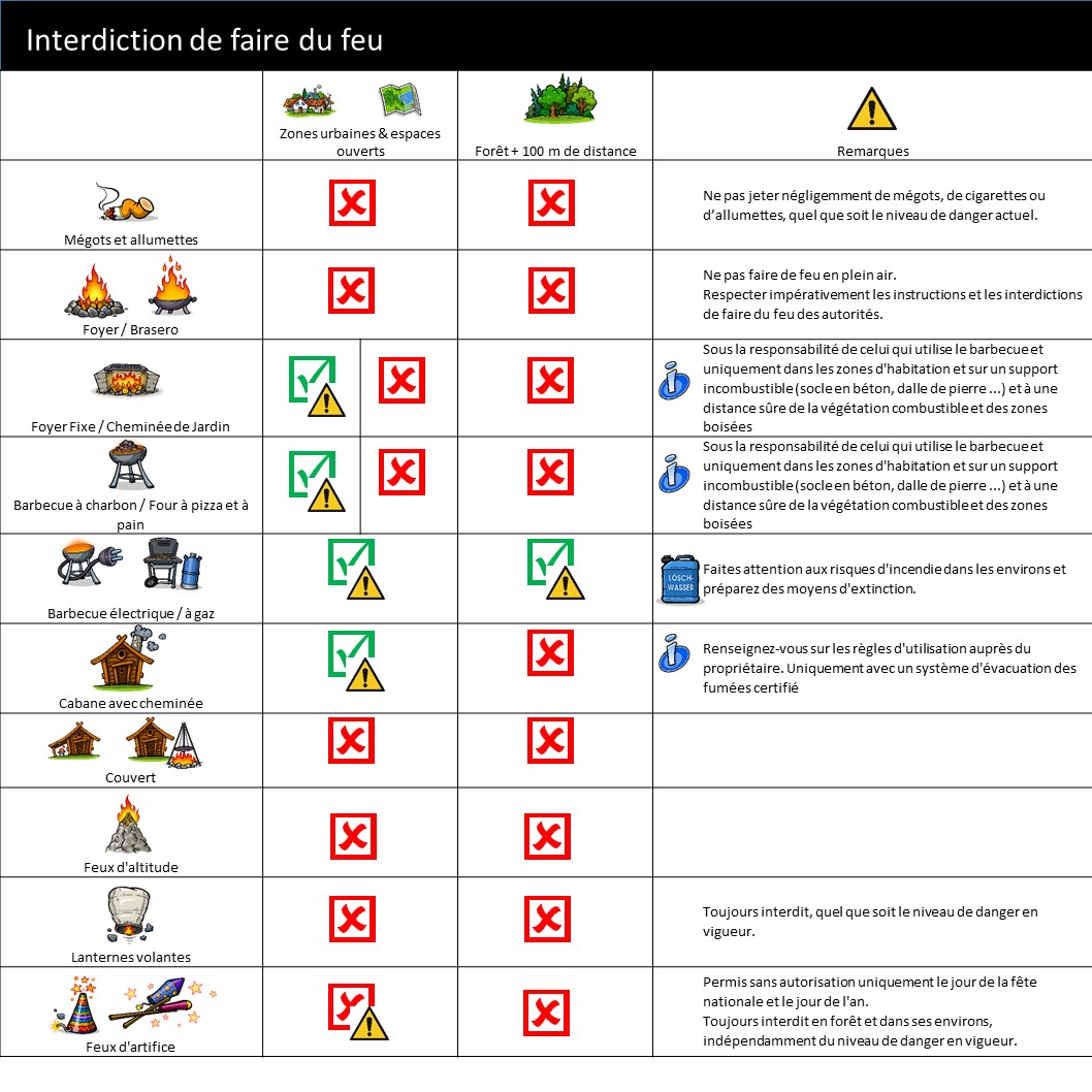 Tous les feux à flamme ouverte ou n'importe quel acte qui puisse causer un début d'incendie sont absolument interdits indépendamment du lieu et de leur justification (grillades, feux commémoratifs...)