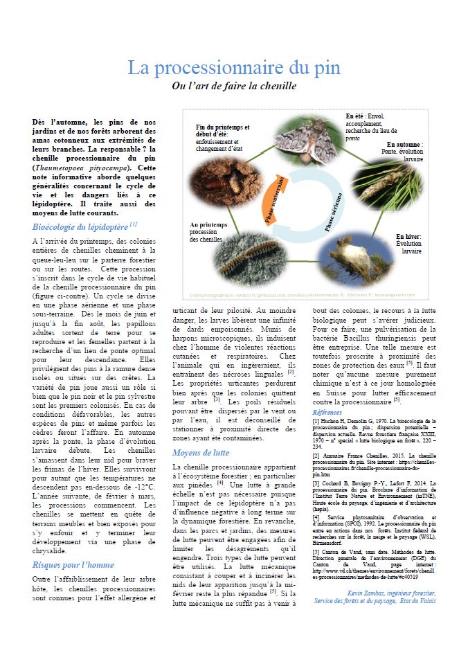 Dès l’automne, les pins de nos jardins et de nos forêts arborent des amas cotonneux aux extrémités de leurs branches. La responsable ? La chenille processionnaire du pin (Thaumetopoea pityocampa). Cette note informative aborde quelques généralités concernant le cycle de vie et les dangers liés à ce lépidoptère. Il traite aussi des moyens de lutte courants.