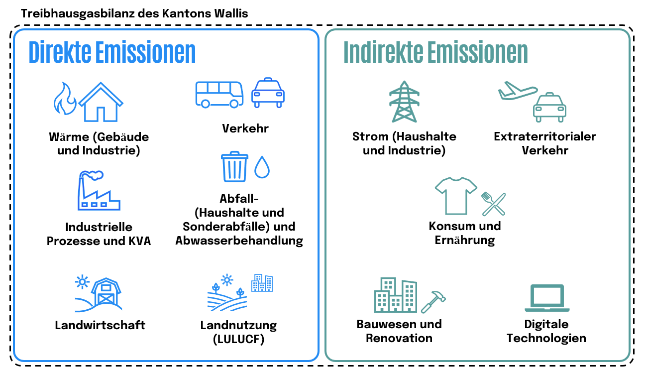 Es handelt sich dabei um im Wallis entstandene Emissionen (direkte Emissionen) und um importierte Emissionen durch den Kauf von im Ausland oder ausserkantonal produzierter Güter und Dienstleistungen (indirekte Emissionen).