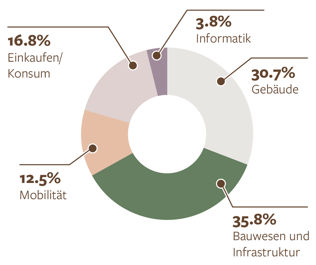 Arbeiten im Zusammenhang mit Gebäuden und der Strasseninfrastruktur sind die grössten Emissionsposten und machen allein mehr als 60% der Gesamtemissionen aus.