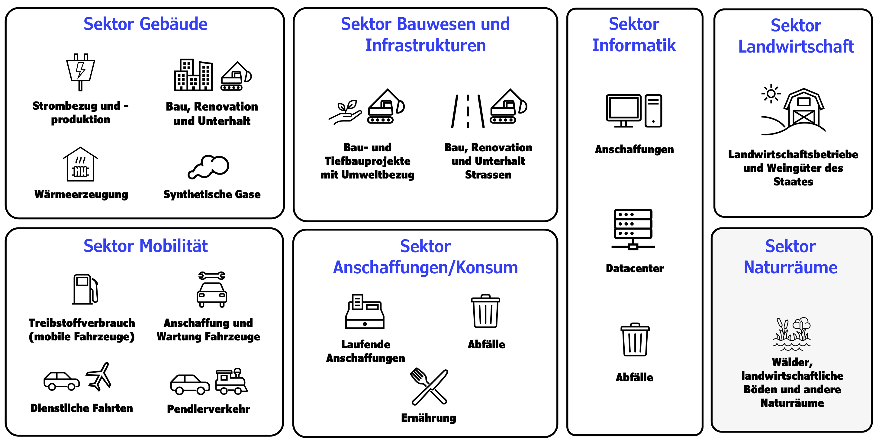- Direkte Emissionen (auch territorial genannt, oder Scope 1) entstehen im Kanton.