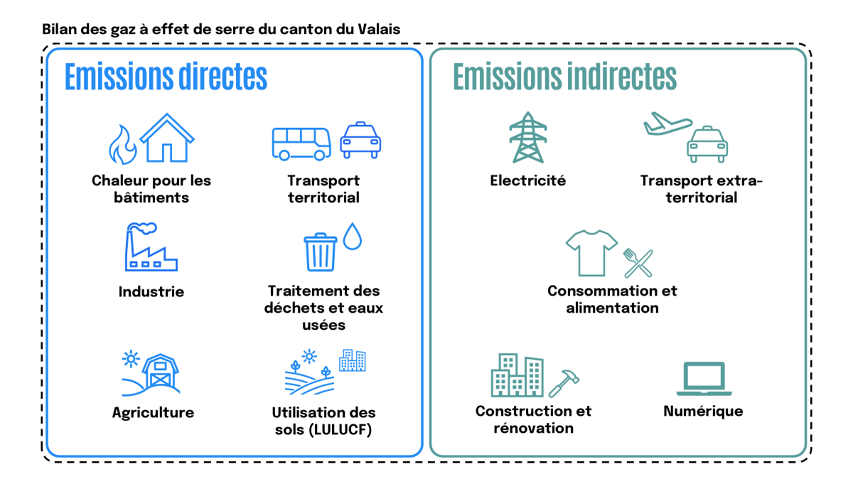 - Les émissions indirectes (aussi appelées extraterritoriales, ou scope 2 et 3) sont liées à la consommation ou aux activités du Valais, mais émises en dehors de ses frontières.