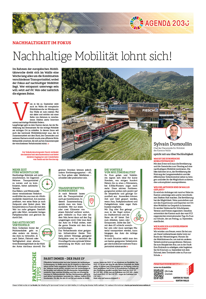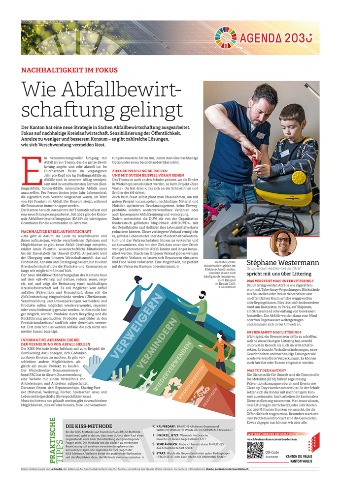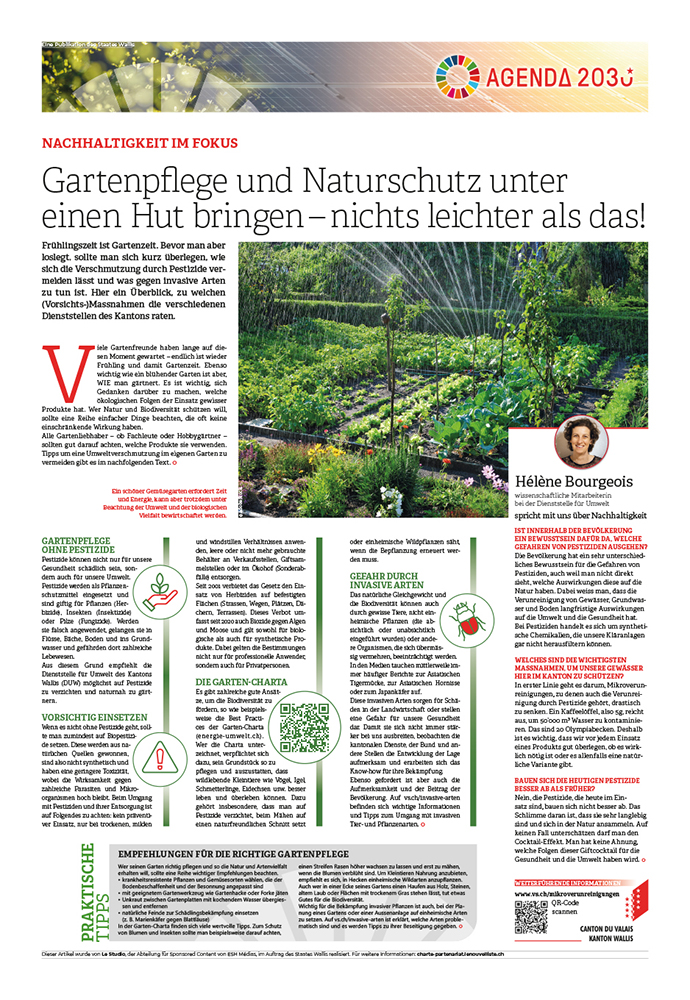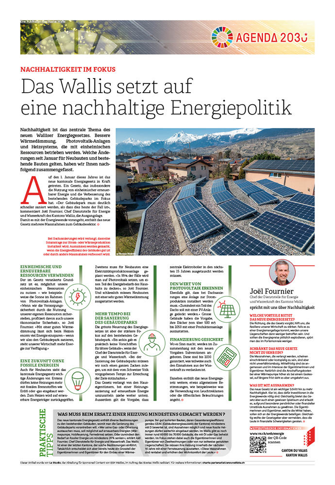 Die Seiten "Nachhaltigkeit im Fokus" sind das Ergebnis einer Zusammenarbeit zwischen dem Kanton Wallis und den Walliser Tageszeitungen "Le Nouvelliste" und "Walliser Bote". Sie zielen darauf ab, ein breites Publikum für Themen im Zusammenhang mit der Nachhaltigkeit zu sensibilisieren (Wirtschaft, Bildung, Umwelt, Energie, Verkehr, Tourismus, soziale Entwicklung, Arbeitnehmerschutz usw.).