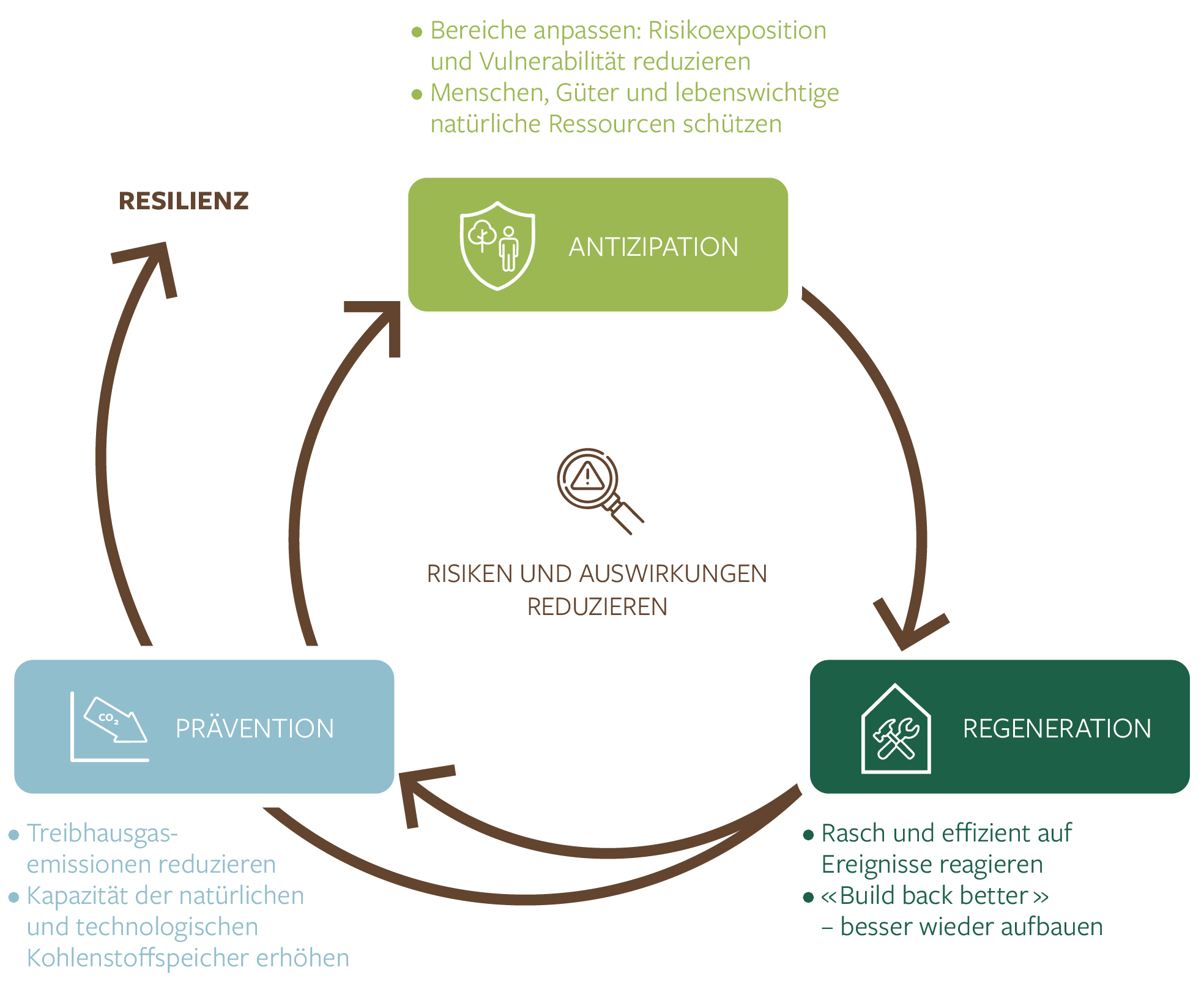 Es geht darum, neue Risiken vorzubeugen, indem die Treibhausgasemissionen reduziert werden, bestehende Risiken vorzubeugen, indem Menschen und Güter geschützt werden, und Restrisiken zu bewältigen, indem die Situation nach Extremereignissen wiederhergestellt wird.