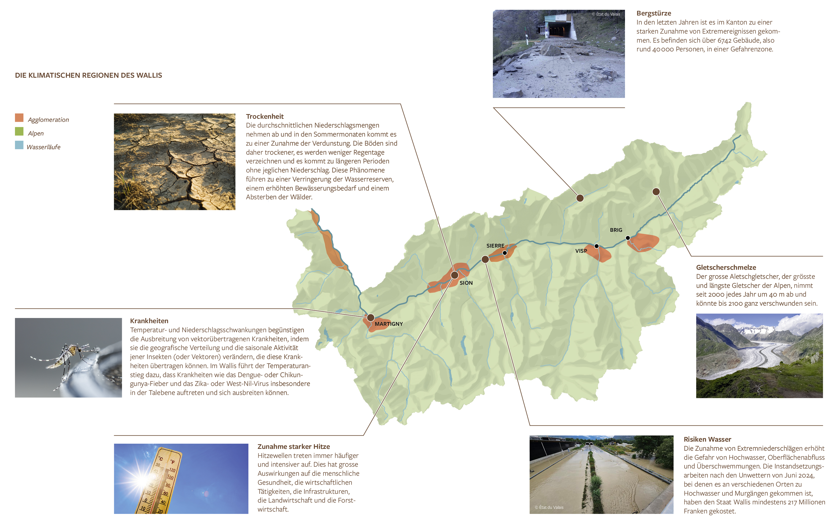 Alpine Regionen wie das Wallis sind besonders anfällig für diese Situation, deren Auswirkungen auf dem Kantonsgebiet bereits spürbar sind: Hitzewellen, Dürren, Starkregen, Überschwemmungen, Felsstürze, Murgänge usw.
