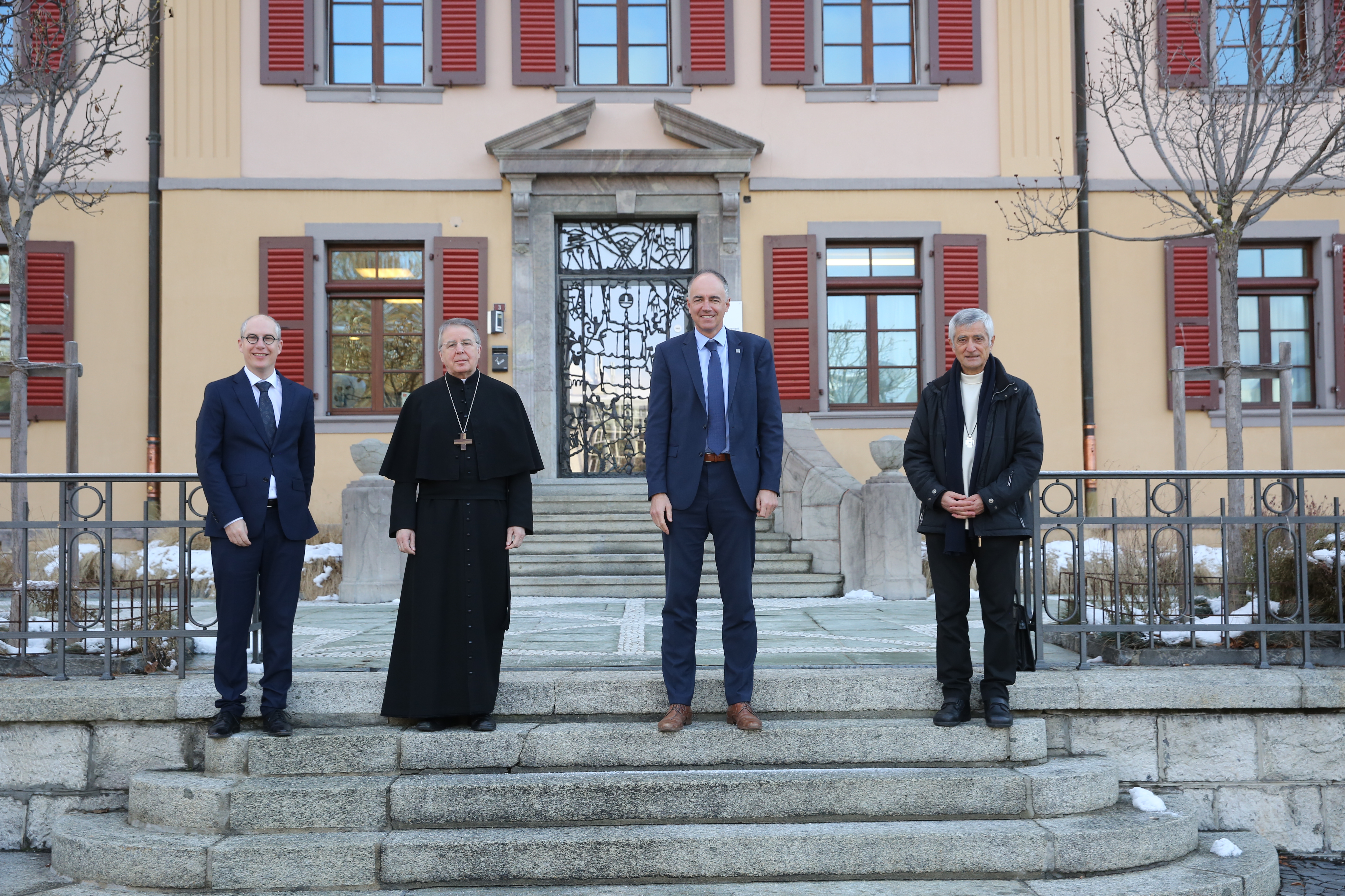 Gilles Cavin (Präsident des Synodalrats), Mgr Jean Scarcella (Abt von St-Maurice), Christophe Darbellay (Vorsteher des Departements für Volkswirtschaft und Bildung), Mgr Jean-Marie Lovey (Bischof der Diözese von Sitten).