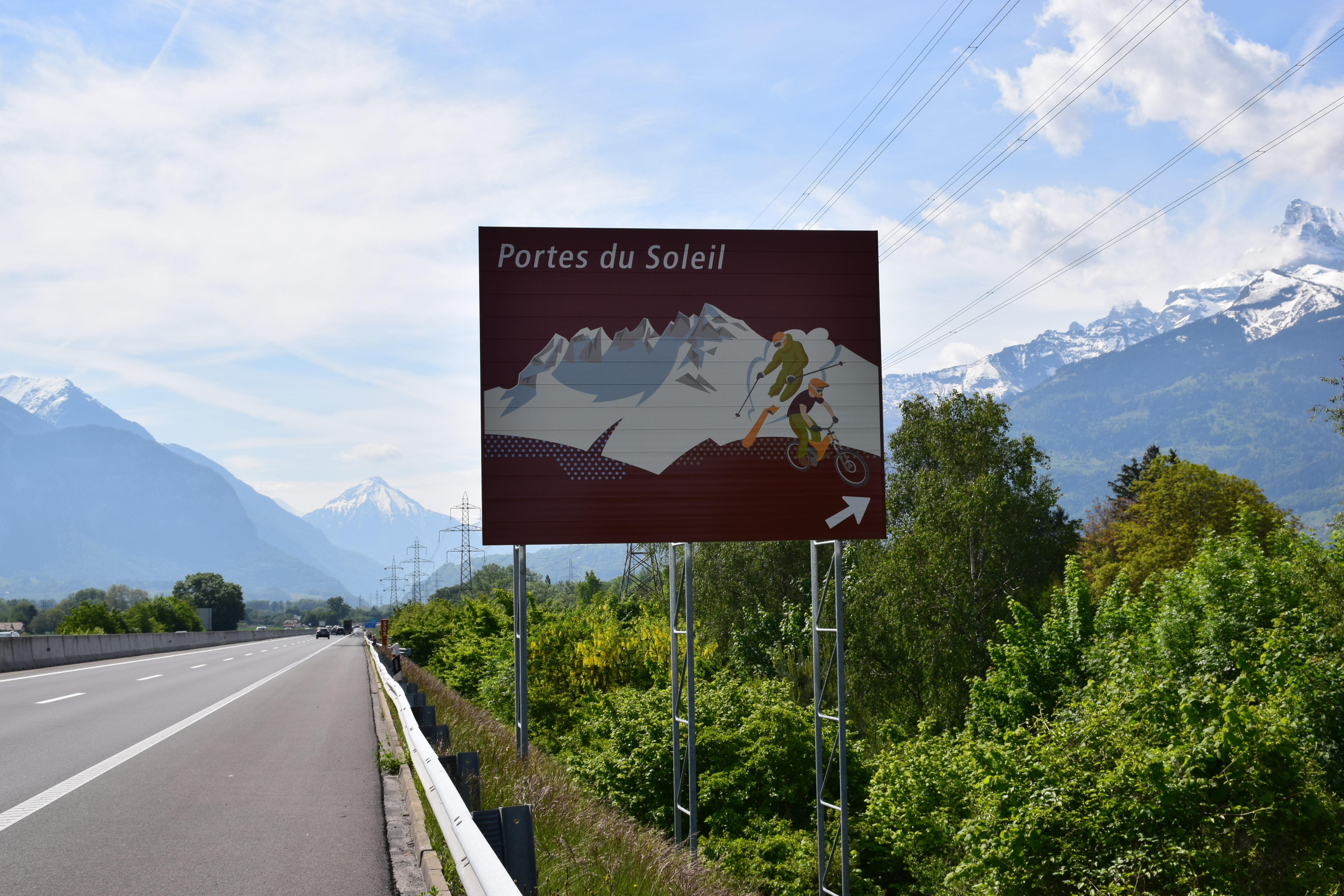 Touristische Beschilderung entlang der Autobahn im Walliser Chablais