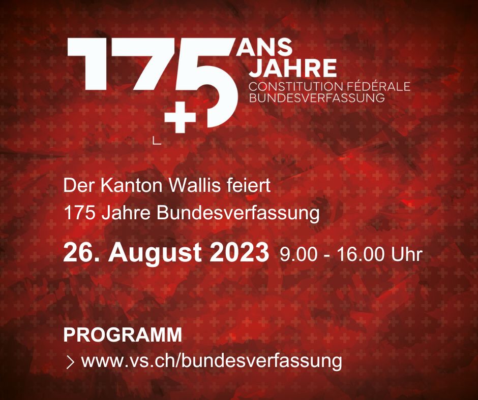 Anlässlich des 175-Jahr-Jubiläums der Bundesverfassung veranstaltet der Kanton Wallis am 26. August 2023 in mehreren öffentlichen Gebäuden in Sitten einen Tag der offenen Türen. Die Öffentlichkeit erhält Zugang zum Kantonsparlament, dem Justizgebäude und dessen Bibliothek sowie zum Rathaus von Sitten. Ausserdem stehen Führungen, Ausstellungen, Vorträge und simulierte Parlamentsdebatten auf dem Programm. Der offizielle Teil mit den kantonalen und kommunalen Behörden sowie der Burgergemeinde findet ab 12.00 Uhr auf dem Pausenplatz des Kollegiums La Planta statt.
