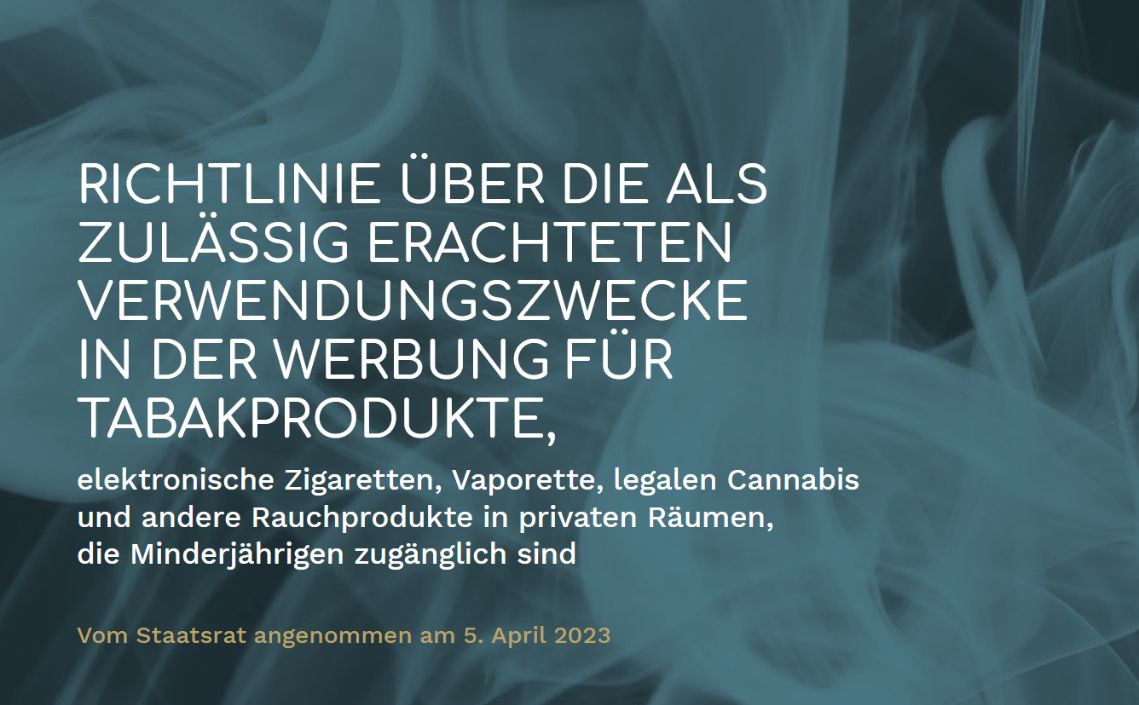 Am 5. April hat der Walliser Staatsrat die Richtlinie zur Umsetzung des Werbeverbots für Tabakprodukte, elektronische Zigaretten, Vaporetten, legalen Cannabis und anderen Rauchprodukten verabschiedet. Zur Erinnerung: dieses Verbot geht aus dem kantonalen Gesundheitsgesetz hervor und ist seit dem 1. Januar 2021 in Kraft. Die Händler im Kanton dürfen unter anderem keine Logos von Tabakproduktmarken mehr aufhängen oder über Sonderangebote im Zusammenhang mit diesen Produkten informieren. Dieses Verbot gilt an allen Orten, die Minderjährigen zugänglich sind.