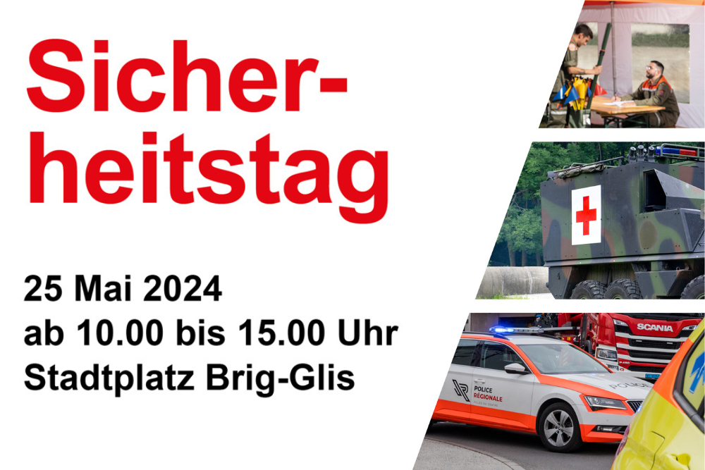 Der zweite Sicherheitstag findet am Samstag, den 25. Mai 2024, von 10.00 bis 15.00 Uhr auf dem «Stadtplatz in Brig-Glis» statt. Die Bevölkerung ist eingeladen, an dieser Veranstaltung teilzunehmen. Ziel ist es, die verschiedenen Aktivitäten der im Sicherheitsbereich tätigen Partner vorzustellen, aber auch die junge Generation zu motivieren, sich den verschiedenen Rettungsorganisationen anzuschliessen.