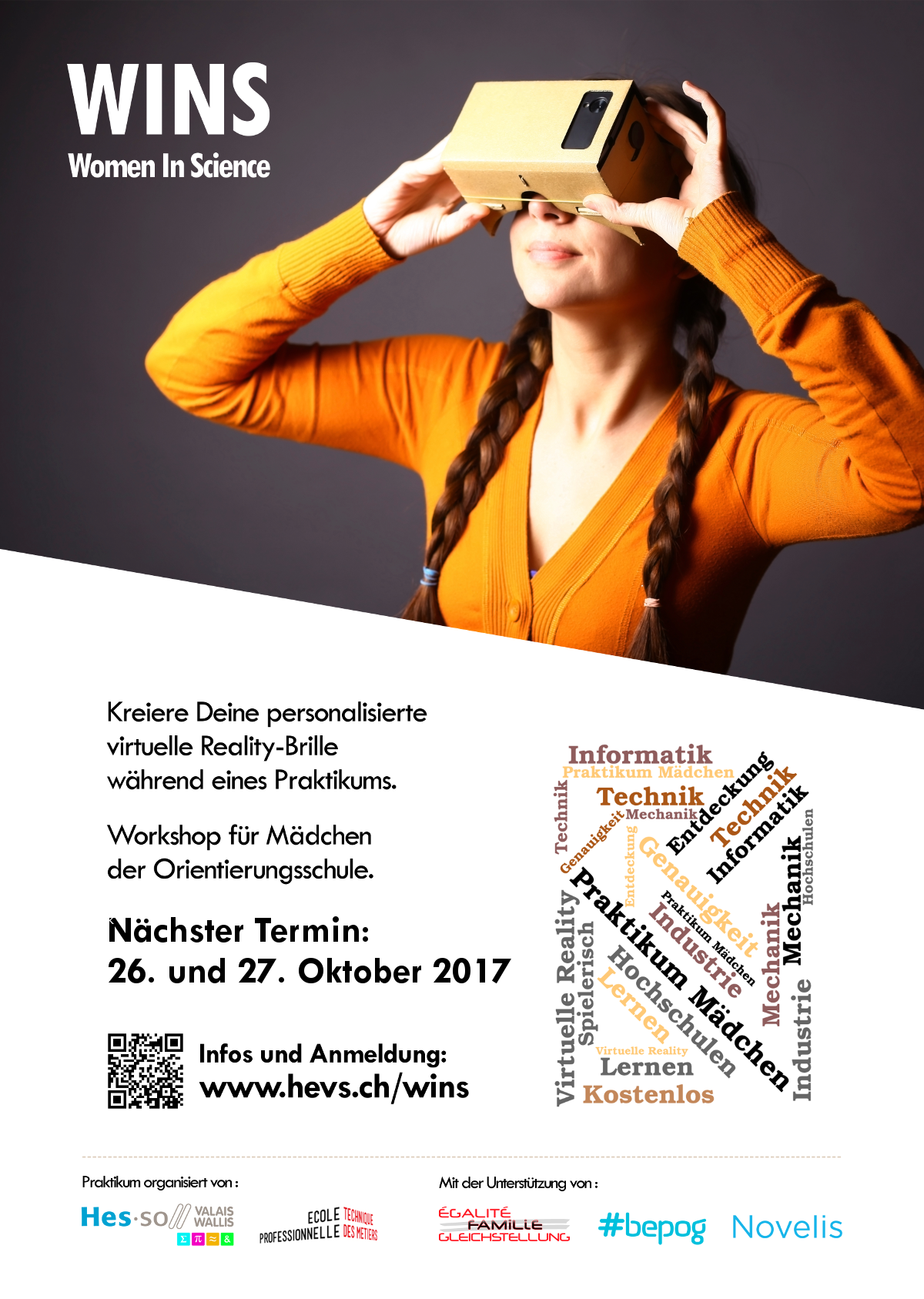 Dieses fünfte WINS-Praktikum findet am 26. und 27. Oktober in Sitten statt. Das Modul wird in Deutsch und Französisch durchgeführt. Es steht in der Liste der Praktika, die den Orientierungsschülern und -schülerinnen im Rahmen der Berufswahlvorbereitung angeboten werden. Interessierte können sich direkt unter www.hevs.ch/wins anmelden.