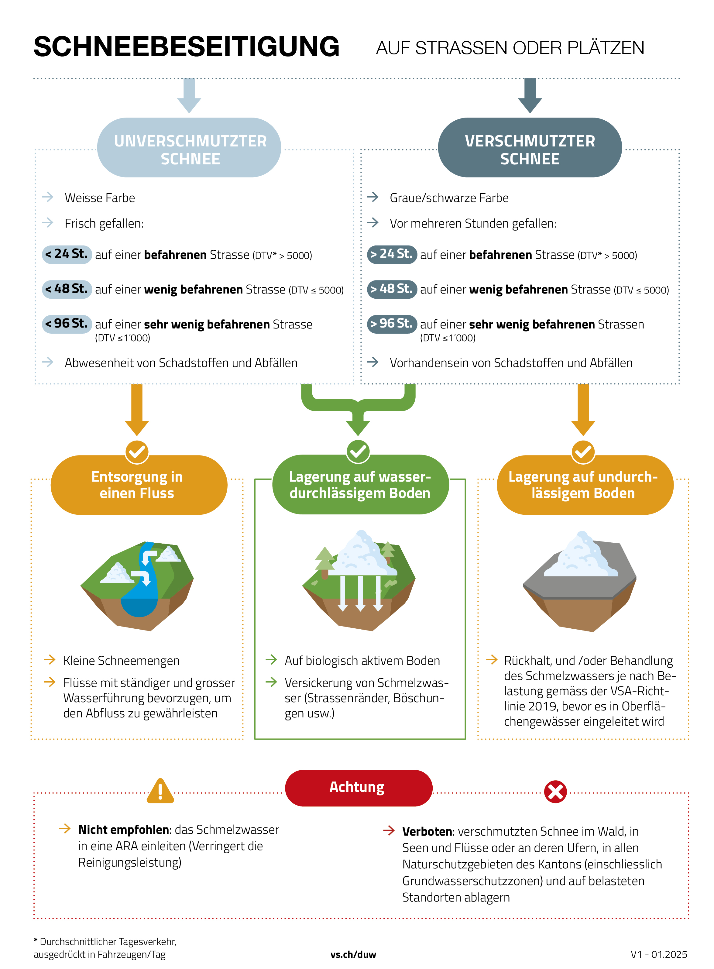 Beim Winterdienst sind die Methoden zur Schneebeseitigung besonders wichtig, um den Gewässerschutz zu gewährleisten. Die Lagerung des Schnees sollte vorzugsweise auf einem durchlässigen Boden erfolgen, damit das Schmelzwasser nach und nach gefiltert werden kann. Das Einleiten von Schnee in Wasserläufe sollte vermieden werden, und es wird abgeraten, Schmelzwasser in ARAs einzuleiten; dies verringert die Wirksamkeit der Abwasserreinigung. Bestimmte Praktiken wie das Ablagern von verschmutztem Schnee in Wäldern oder Naturschutzgebieten sind verboten. Die Eigenschaften von sauberem bzw. belastetem Schnee zu unterscheiden, ist der erste Schritt, um die richtigen Entscheidungen zu treffen. Um die Verantwortlichen für die Schneeräumung auf Kantons- und Gemeindestrassen und -plätzen zu unterstützen, wurde im Februar 2025 ein Merkblatt mit guter Praxis herausgegeben. Ein Entscheidungsschema ermöglicht es, je nach Situation mühelos die beste Methode zu wählen. Dieses Instrument wurde von der Dienststelle für Umwelt (DUW) in Zusammenarbeit mit den Dienststellen für Mobilität, Naturgefahren und Wald, Natur und Landschaft entwickelt.