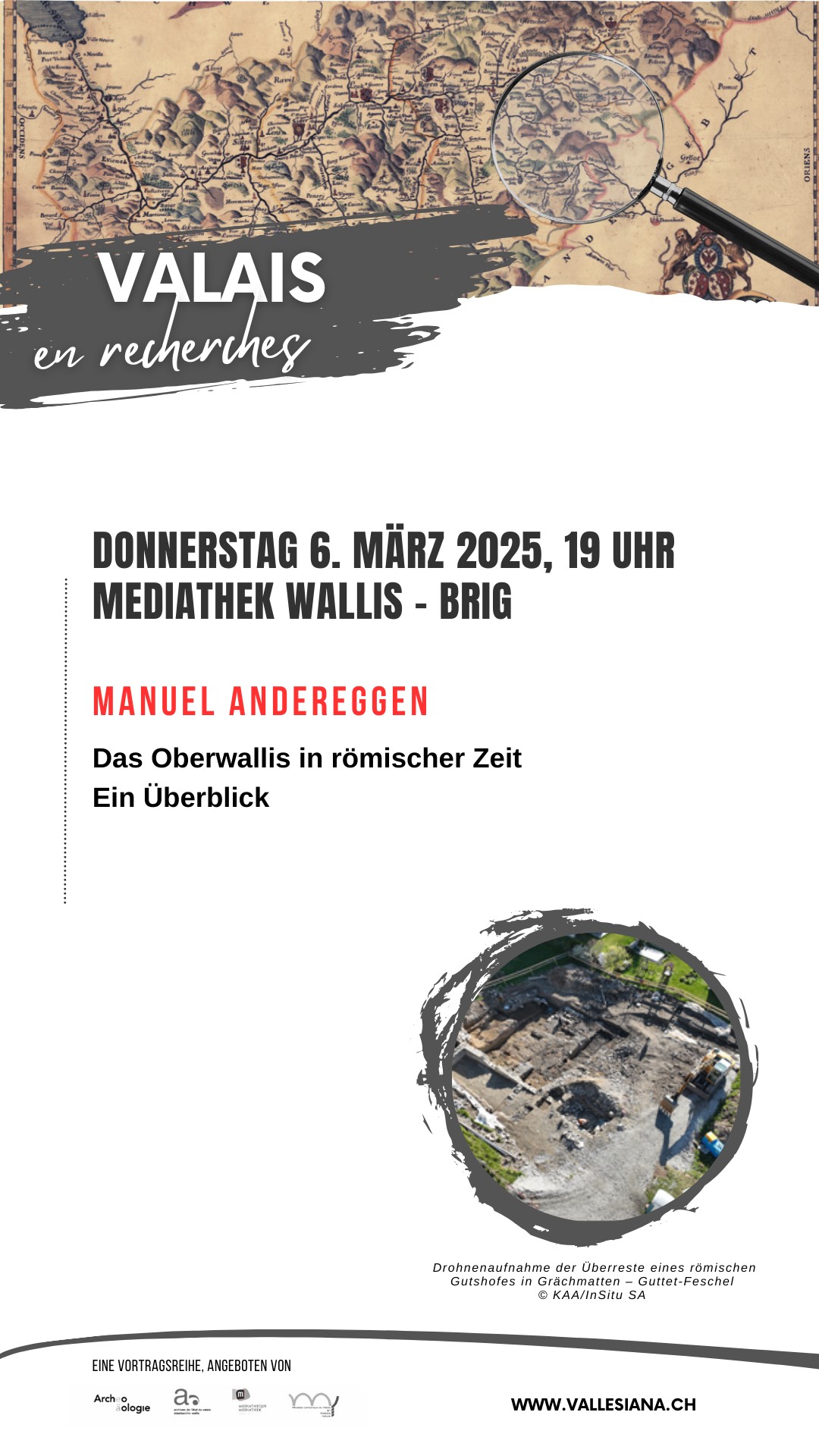 Neuentdeckungen in Mörel, Guttet, Glis und Salgesch zeigen, dass das Oberwallis, trotz einiger Eigenheiten, durch Handel und Wirtschaft mit dem gesamten Römischen Reich verbunden war. Manuel Andereggen, Archäologe bei Insitu Archéologie, wird Ihnen über diese jüngsten Entdeckungen berichten.